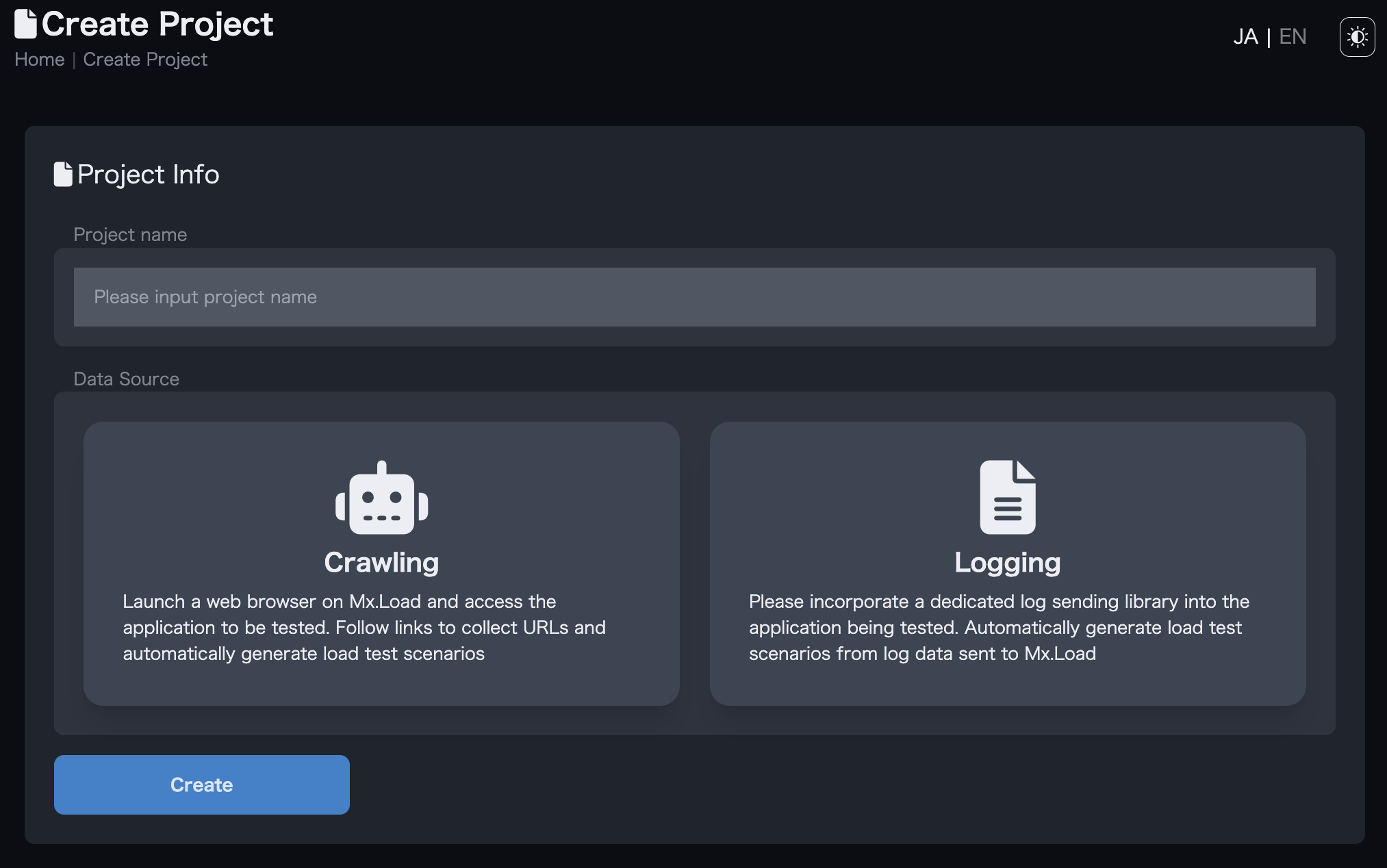 Mx.Load testing settings and execution are performed from the detailed screen of the created project.