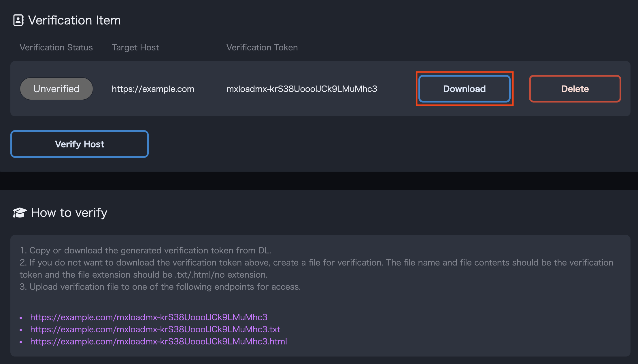 The downloaded file will have a file name such as mxloadmx-JwjGW3QuFHweayIzrxiz3.txt, with the verification token as the file name and the extension .txt, and the file will contain only the verification token.
