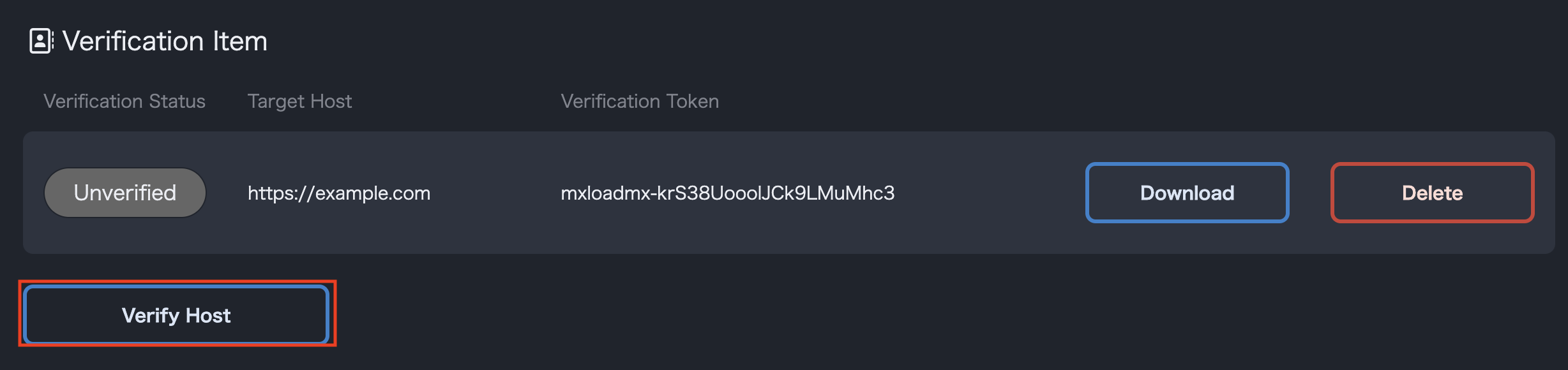 Registration of target hosts requires verification involving user server operations, and passing the verification by Mx.Load allows you to perform load testing.